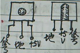 再用红笔接[地]脚,黑笔去测另外两脚,一般在15K以上,同样是阻值小的为电源脚,阻值大的为信号脚。