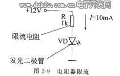 如图2-9所示发光二极管电路中,R为限流电阻。从欧姆定律I=U/R可知,当电压U一定时,流过电阻器的电流J与其阻值R成反比。由于限流电阻R的存在,将发光二极管VD的电流限制在10mA,保证VD正常工作。