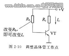 调整晶体管的工作点是电阻器用作限流的一个例子。如图2-10所示为晶体管放大电路,晶体管集电极电流Ic(工作点)由其基极电流Ib决议。改动晶体管基极电阻Rb的阻值,即可改动Ib,也就是改动了Ic,即改动了晶体管的工作点。