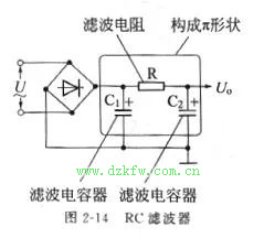 RC滤波网络是一种特殊的分压器。如图2-14所示整流滤波电路中,R与C2可了解为分压器,输出电压Uo取自C2上的压降。关于直流C2的容抗无限大,而关于交流C2的容抗远小于R,因而C2上直流压降很大,而交流压降很小,到达扩滤波的目的。