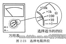 (1)指针式万用表检测检测时,首先依据电阻器阻值的大小,将指针式万用表(以下简称万用表)上的挡位旋钮转到恰当的“Q”挡位,如图2-23所示。
