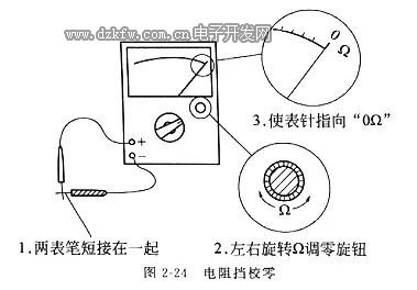 测量挡位选定后,还需对万用表电阻挠停止校零。如图2-24所示将万用表两表笔相互短接,转动“调零”旋钮使表针指向电阻刻度的“0”位(满度)。需求特别留意的是丈量中每改换一次挡位,均应重新对该挡停止校零。