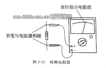 将万用表两表笔(不分正、负)分别与待测电阻器的两端引线相接,如图2-25所示,表针应指在相应的阻值刻度上。如表针不动、指示小稳定或指示值与电阻器上标示值相差很大,则阐明该电阻器已损坏。