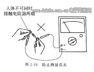 在测量几十千欧以上阻值的电阻器时,留意不可用手同时接触电阻器的两端引线,如图2-26所示,以免接入人体电阻带来丈量误差。