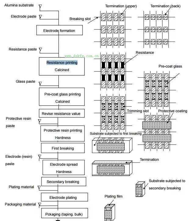 厚膜电阻采用的丝网印刷法,就是再陶瓷基底上贴一层钯化银电极,然后在电极之间印刷一层二氧化钌作为电阻体。厚膜电阻的电阻膜通常比较厚,大约100微米。具体工艺流程如下图所示。