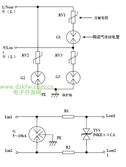 为了避免气体放电管放电后电流持续,当线地之间电压差值较大时,也可以在放电管上串联压敏电阻等器件限制续流。这样做虽然使得两条输入线的浪涌抑制方式有异,但是可以使得浪涌过后流过气体放电管电流小于放电管的维持电流,而非将气体放电管直接串联在高压线与大地之间。