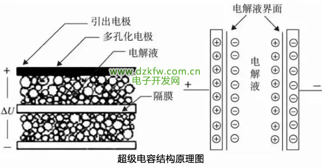 2、超级电容器在分离出的电荷中存储能量,用于存储电荷的面积越大、分离出的电荷越密集,其电容量越大。