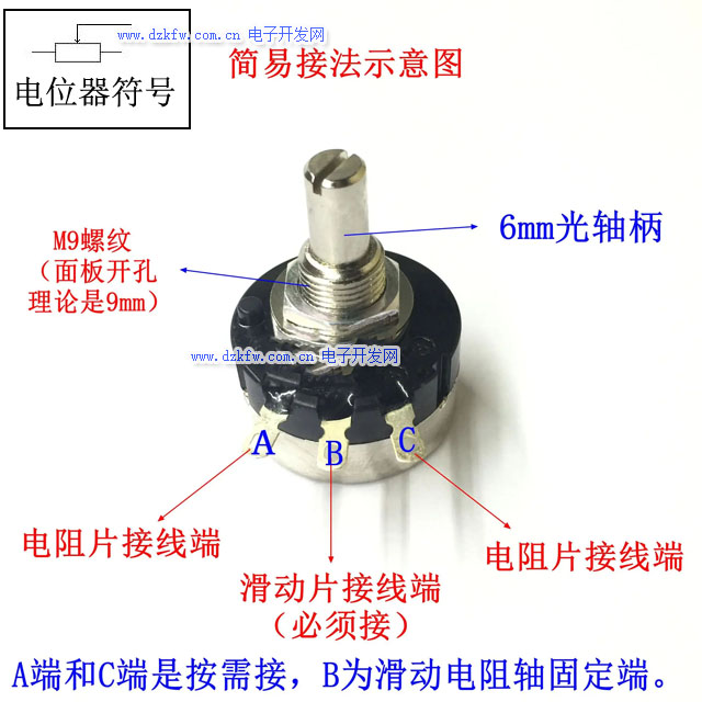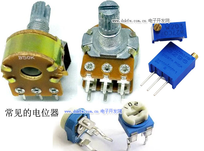 电位器是一个连续可调的电阻器,当调节电位器的转柄或滑柄时,动触点在电阻体上滑动,此时在电位器的输出端,可获得与电位器外加电压和可动臂转角或行程,成一定关系的输出电压。