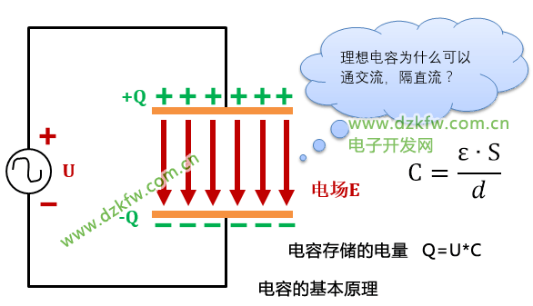 如上图所示,在两块距离较近、相互平行的金属平板上(平板之间为电介质)加载一个直流电压;稳定后,与电压正极相连的金属平板将呈现一定量的正电荷,而与电压负极相连的金属平板将呈现相等量的负电荷;这样,两个金属平板之间就会形成一个静电场,所以电容是以电场能的形式储存电能量,储存的电荷量为Q。