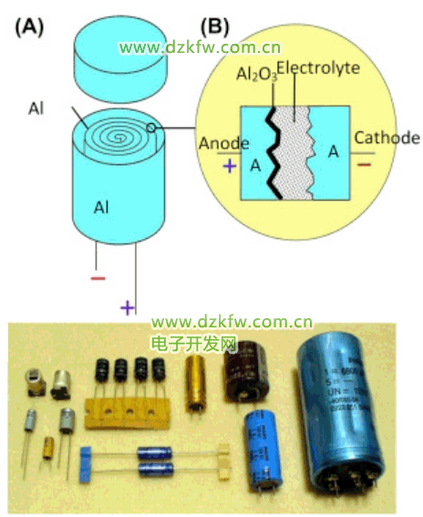 如图所示,铝电解电容器的基本结构由阳极、附着在绝缘介质上的铝层、接收电极的阴极铝层和由电解质构成的真正阴极组成。电解液浸在两层铝层之间的纸中。铝层上镀有氧化铝层,非常薄,容易被击穿,导致电容器失效。