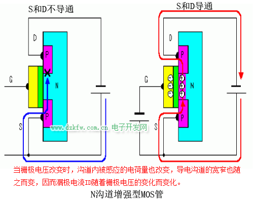 MOS管的工作原理(以N沟道增强型MOS场效应管)它是利用VGS来控制“感应电荷”的多少,以改变由这些“感应电荷”形成的导电沟道的状况,然后达到控制漏极电流的目的。