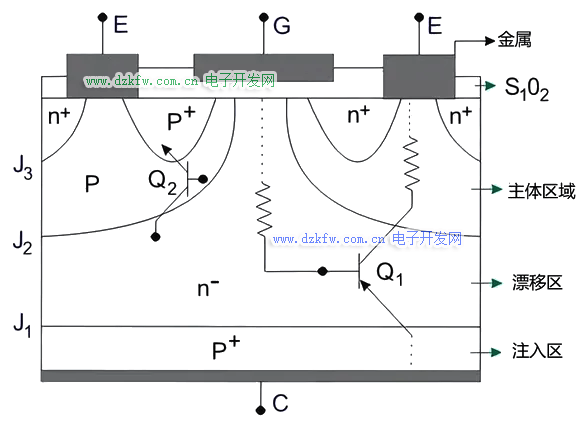 收集器区域(或注入区域)和 N 漂移区域之间的连接点是 J2。类似地,N-区域 和 主体区域之间的结点是结点 J1。