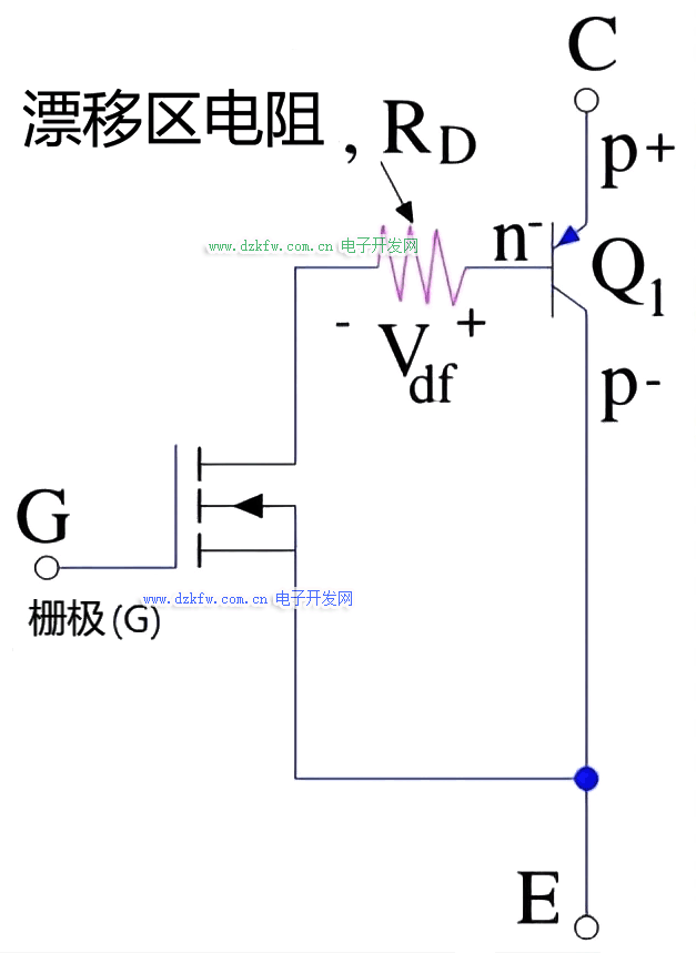 众所周知,IGBT是 MOS 管的输入和 BJT 的输出的组合,它具有与N沟道MOS管和达林顿配置的PNP BJT等效的结构,因此也可以加入漂移区的电阻。