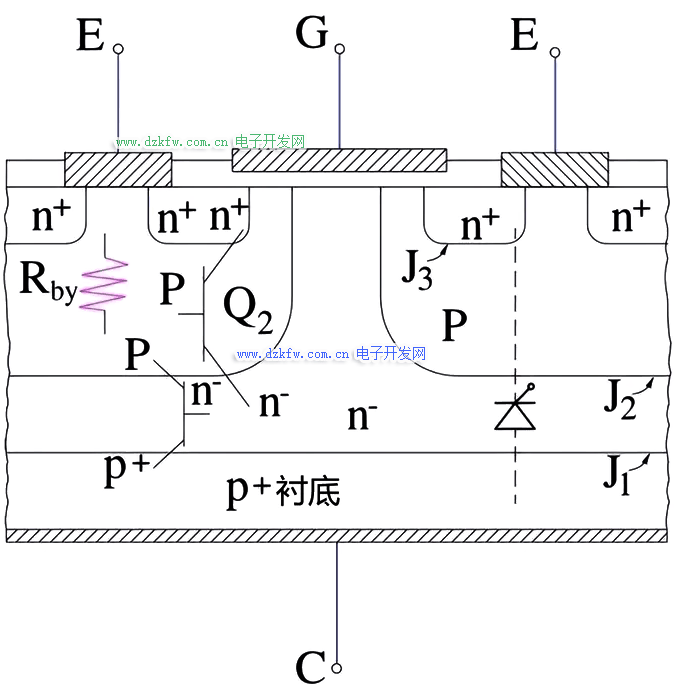 仔细检查 IGBT 的基本结构,可以得出这个等效电路,基本结构如下图所示。