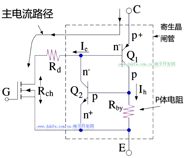 IGBT 中的集电极电流 Ic由两个分量 Ie和 Ih组成。Ie是由于注入的电子通过注入层、漂移层和最终形成的沟道从集电极流向发射极的电流。Ih是通过 Q1和体电阻 Rb从集电极流向发射极的空穴电流。因此