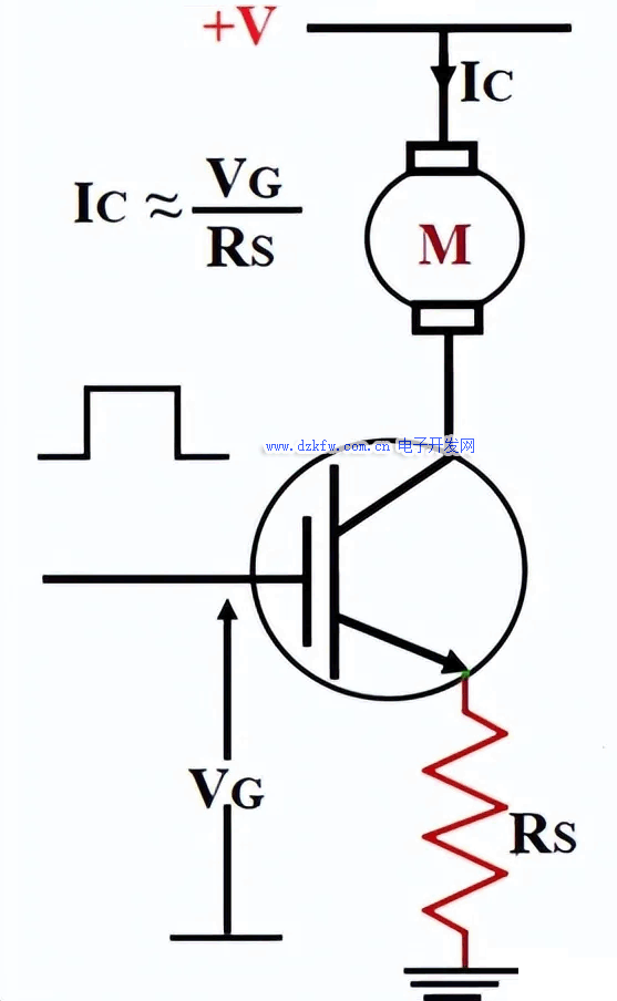 由于是单向器件, IGBT 只能在从集电极到发射极的正向切换电流。IGBT的典型开关电路如下所示,栅极电压 VG施加到栅极引脚以从电源电压 V+ 切换电机 (M)。电阻 Rs 大致用于限制通过电机的电流。