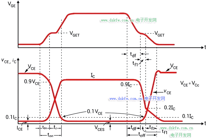 延迟时间 (t dn ):定义为集电极电流从漏电流 ICE上升到 0.1 IC(最终集电极电流)和集电极发射极电压从 VCE下降到 0.9VCE的时间。
