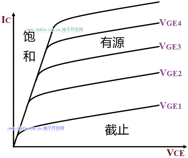 第三阶段:当 VGE增加到超过阈值电压时,IGBT 进入有源区,电流开始流过 IGBT 。如下图所示,电流将随着电压 VGE的增加而增加。