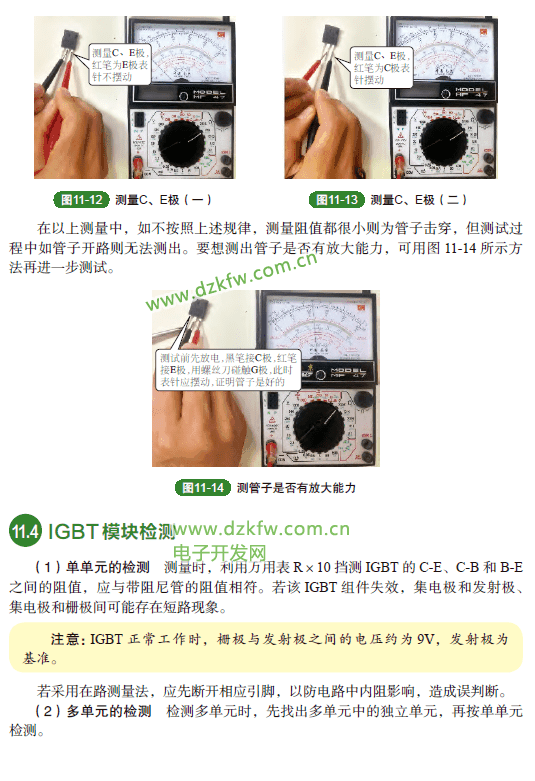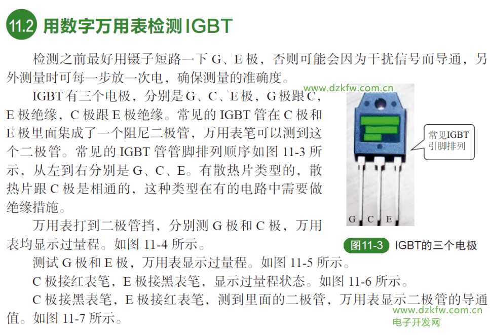 其图形符号如图11-1所示。IGBT基本结构如图11-1 ( a)所示,是由栅极G、发射极C、集电极E组成的三端口电压控制器件,常用N沟道IGBT内部结构简化等器件,常用N沟道IGBT内部结构简化等效电路如图11-1 (b)所示。IGBT的封装与普通双极型大功率三极管相同,有多种封装形式,如图11-2所示。