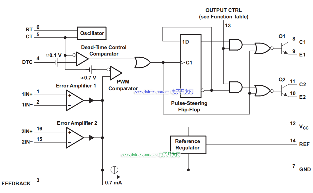 (1)具有两个完整的脉宽调制控制电路,是PWM芯片;