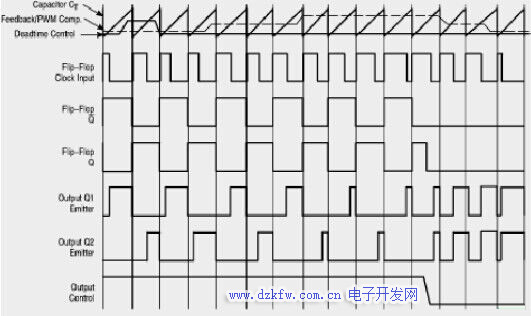 输出脉冲的宽度是通过电容CT.上的正极性锯齿波电压与另外两个控制信号进行比较来实现。功率输出管Q1和Q2受控于或非门。当双稳触发器的时钟信号为低电平时才会被选通,即只有在锯齿波电压大于控制信号期间才会被选通。当控制信号增大,输出脉冲的宽度将减小。参见下图。