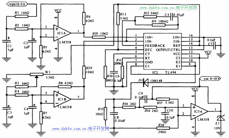 为了把脉宽变化的方波信号转换为大小变化的直流信号,通过开关二极管D1、 电容C8进行整流滤波。R15作为整流滤波的输出负载,还在脉冲截止期间为C8提供放电回路,使C8上的电压与TL494输出的脉宽成正比。为使输出电压进一步平滑、提高带负载能力以及使输出电压在0~10V之间变化,又加入了一级压控电压源二阶低通滤波电路。在图中所示元件参数下,最大的直流输出电压是10V IC3A输出端接的10V稳压二极管, 是保证在意外的情况下,使输出电不大于10V。