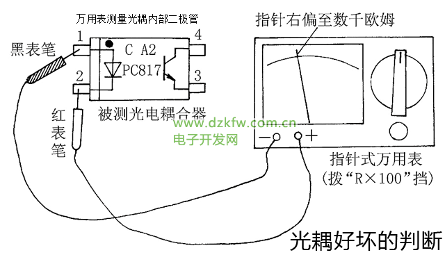这里以MF50型指针式万用表和4脚PC817型光电耦合器为例,说明具体检测方法:首先,按照图1(a)所示,将指针式万用表置于“R×100”(或“R×1k”)电阻挡,红、黑表笔分别接光电耦合器输入端发光二极管的两个引脚。如果有一次表针指数为无穷大,但红、黑表笔互换后有几千至十几千欧姆的电阻值,则此时黑表笔所接的引脚即为发光二极管的正极,红表笔所接的引脚为发光二极管的负极。
