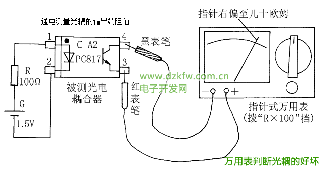 然后,按照图1(b)所示,在光电耦合器输入端接入正向电压,将指针式万用表仍然置于“R×100”电阻挡,红、黑表笔分别接光电耦合器输出端的两个引脚。如果有一次表针指数为无穷大(或电阻值较大),但红、黑表笔互换后却有很小的电阻值(<100Ω),则此时黑表笔所接的引脚即为内部NPN型光敏三极管的集电极c、红表笔所接的引脚为发射极e。当切断输入端正向电压时,光敏三极管应截止,万用表指数应为无穷大。这样,不仅确定了4脚光电耦合器PC817的引脚排列,而且还检测出它的光传输特性正常。如果检测时万用表指针始终不摆动,则说明光电耦合器已损坏。