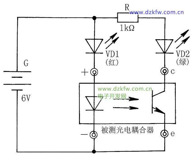 制作时,VD1用红色闪烁发光二极管,VD2用绿色普通发光二极管。R用RTX-1/8W型碳膜电阻器。4个管脚插孔可用0.4mm~0.6mm的裸铜丝,在一枚2号大头针上密绕十几圈,并在尾端留出长度大于3cm的焊接引线(应套上绝缘管),然后脱胎而成。G用4节5号干电池串联(6V)而成,如用4F20-6V型叠层干电池会更方便。整个电路可焊装在一个体积合适的塑料小盒内,面板开孔伸出两个发光二极管的管帽和4个插孔。注意:输入和输出插孔的间距不要超过1cm,各插孔伸出的引线长度不要小于2cm,便于灵活互换位置,以适应不同型号和引脚排列的光电耦合器检测。本装置不设电源开关,用毕拔掉光电耦合器,电源即被自动切断。
