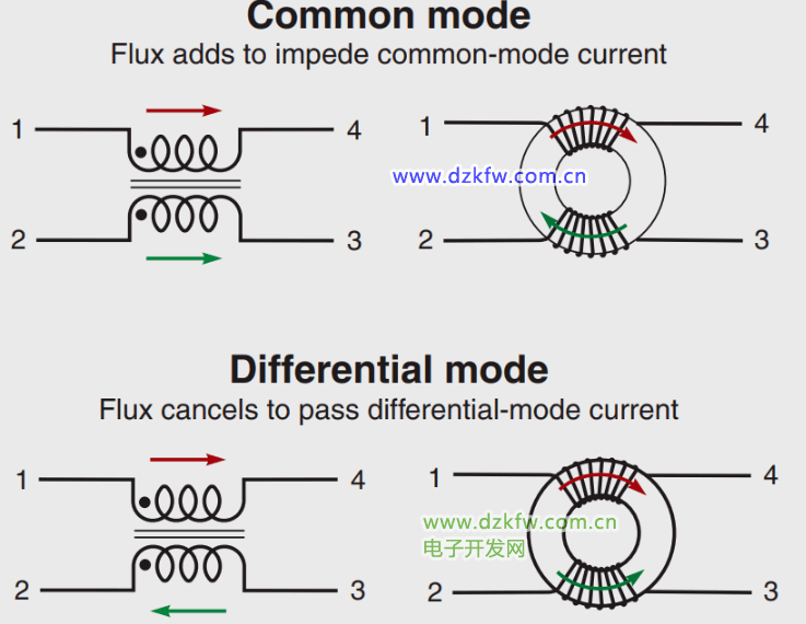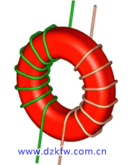 根据右手螺旋定理,当差模电流流过共模电感线圈时,产生2个相互抵消的磁场;当共模电流流过共模线圈时,产生2个相互增强的磁场,使整个线圈阻抗变高,衰减共模电流。