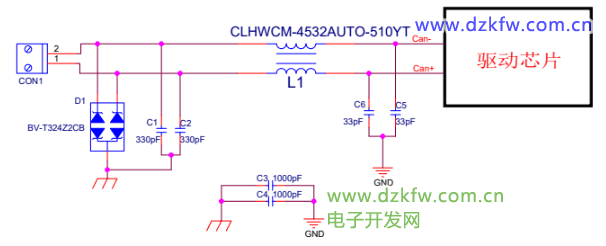 共模电感除了在电源系统中使用之外,还可以在通信电路中使用,比如下图:在CAN总线和RS485总线中的使用: