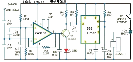 在这种类型的电路(使用频率高0.9 - 3GHz的),你不能使用的频率调谐LC电路,该电路使用一个0.22pF的磁盘电容(C3)根据射频电路,以确保电路的能力,捕捉手机信号。这种手机探测器可以探测到任何一部手机的活动:传入或传出短信,视频传输或语音传输的C3电容必须有信息与8毫米间距之间的信息的长度为18毫米,以获得所需的频率。这个小磁盘电容作为一个小千兆赫的环形天线收集的射频信号。CA3130运算放大器IC使用电流电压转换器,这种手机探测器电子电路图,可用于验证存在一个活跃的手机在测试区域。