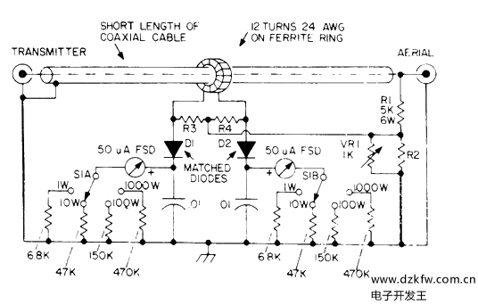 这个电路提供了100kHz和70MHz之间的1070精确度。满刻度值的范围是1,10,100和1000W。电流互感器的二级电路中的低电阻分为两个相等的部分,因此二级端可以获得电压和差电压。仪表能够显示正向和反射的功率值。对于50Ω线,R2使用220,R3和R4使用27。对于75Ω线,对应的数值是180和33。