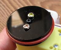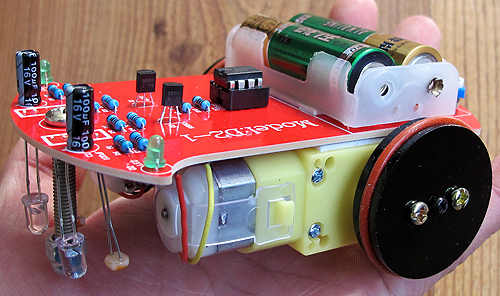 机械部分组装可以先组装轮子,轮子由三片黑色亚克力轮片组成,装配前请将保护膜揭去,最内侧的轮片中心孔是长园孔,中间的轮片直径比较小,外侧的轮片中心孔是园的,用两个螺丝螺母固定好三片轮片,并用黑色的自攻螺丝固定在电机的转轴上,最后将硅胶轮胎套在车轮上。用引线连接好电机引线,最后将车轮组件用不干胶粘贴在PCB制定位置,注意车轮和PCB边缘保持足够的间隙,将电机引线焊接到PCB上,注意引线适当留长一些,防止电机旋转方向错误后便于调换引线的顺序。