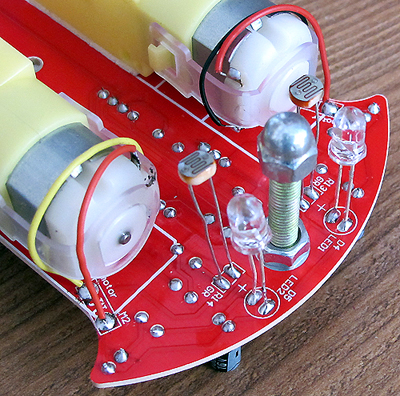 在电池盒内装入2节AA电池,开关拨在“ON”位置上,小车正确的行驶反相是沿万向轮方向行驶,如果按住左边的光敏电阻,小车的右侧的车轮应该转动,按住右边的光敏电阻,小车的左侧的车轮应该转动,如果小车后退行驶可以同时交换两个电机的接线,如果一侧正常另一侧后退,只要交换后退一侧电机接线即可。