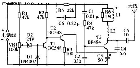 小功率调频信号发射器由晶体管T3、线圈L1等组成,T2起电子开关(接通/断开)的作用,电话线上的音频信号沿晶体管T2及串联电阻R3,对振荡频率进行调制,调制后的高频信号送到天线发射。只要调频接收机调谐到调频发射器的发射频率,就能听到双方的通话。
