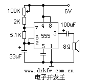 时基电路555构成一个极低频振荡器,输出一个个短的脉冲,使扬声器发出类似雨滴的声音(见附图)。扬声器采用2英寸、8欧姆小型动圈式。雨滴声的速度可以通过100K电位器来调节到合适的程度。如果在电源端增加一简单的定时开关,则可以在使用者进入梦乡后及时切断电源。