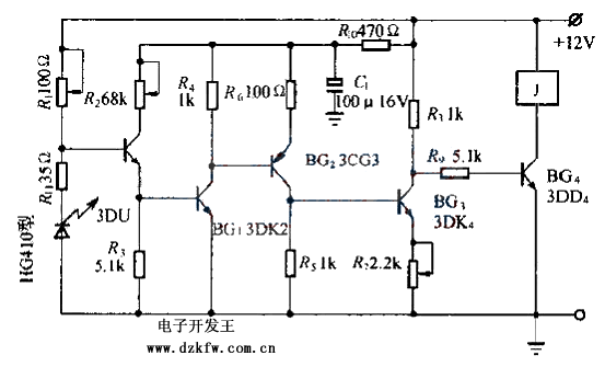 报警装置电路如图。电源接通后,砷化镓红外发光二极管即发出红外光。这些红外光被光电三极管3DU接受,3DU内阻下降,使BG1、BG2、BG3导通,BG4截止,继电器j不动作。点那个红外光被物体或者人体遮住后,3DU内阻变大,使BG1、BG2、BG3截止,BG4导通,继电器J动作,接通报警装置,发出信号。