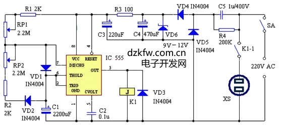 在该电路中,集成电路IC可选用NE555、MA555、LM555、5C1555等时基电路;继电器K1可选用额定工作电压在9V-12V之间的中小功率继电器,其触点功率的大小应根据被控电器的功率大小选定;稳压二极管VD6可选稳压值在12V左右的,如 2DW21等;电容器C5应选用耐压在400V以上的无极性电容器。其它元件无特殊要求,只要按图1中所标的参数选用即可。