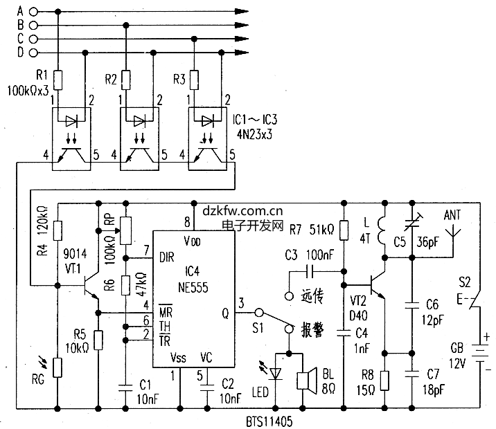 电路原理如图1所示。Rl~R3和光耦合器IC1~IC3(4N23)作隔离取样。光敏电阻RG的亮阻应小于100Ω暗阻大于10MΩ.其作用是白天受光照阻值很小,报警电路不工作.晚上电阻大,可进行报警。如果需要白天和晚上都处于警戒状态.可去掉RG不用。IC4(NE555)接成无稳态振荡器模式.调节RP可获得750~1500Hz报警频率(按f=1.443/(RP+2R6)·C1估算)。S1为现场报警或无线远传报警选择开关.BL为8Ω/0.5W扬声器,LED使用红色频闪发光二极管。VT2等组成调频载波振荡发射电路,L1、C5并联谐振频率即为发射频率,报警信号由1km以外的调频收音机接收。