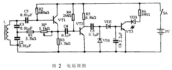 在金属探测器的电感探头L接近金属物体时,振荡电路停振,没有信号通过电容器C4,三极管VT3的基极得不到正电压,所以三极管VT3截止,发光二极管熄灭。