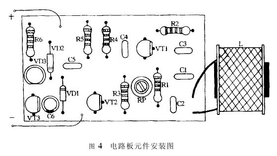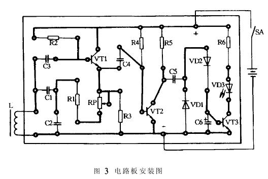 图2是金属探测器电原理图,图3是它的电路板安装图,图4是它的电路板元件安装图。组装前将所用元器件的管脚引线处理干净并镀上锡。对照三个图,依次将电阻器、二极管、电容器、三极管、发光二极管、微调电阻器焊到电路板上,再将电感探头、开关、电池夹连接到电路板上。电路装好,检查无误就可以通电调试。接通电源,将微调电阻器RP的阻值由大到小慢慢调整,直到发光二极管亮为止。然后用一金属物体接近电感探头的磁心端面,这时发光二极管会熄灭。调整微调电阻器RP可以改变金属探测器的灵敏度,微调电阻器RP的阻值过大或过小电路均不能工作。如果调整得好,电路的探测距离可达20mm。但要注意金属探测器的电感探头不要离元器件太近,在装盒时不要使用金属外壳。必要时也可以将金属探测器的电感探头引出,用非金属材料固定它。
