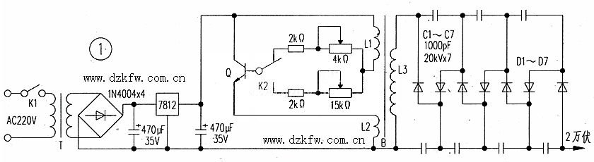 笔者采用高压尖端放电的方法,使空气电离而产生负氧离子的原理,自制了离子发生器,也就是负离子空气清新器。电路见图1。电源变压器T次级输出的18W交流电压经桥式整流、三端稳压块7812稳压、电容滤波后,输出11.5v直流电压供给电感式振荡器。振荡管Q使用高β大功率晶体管,如3DD200、C5148、D1185等,且要加散热片。高频磁芯的高压包组件,电子市场可以找到,也可用14英寸以上黑白电视机分立式高压包。初级用原骨架L1:Φ0.46mm×45T.L2:Φ0.21mm×90T.L3:Φ0.11mm×2000T。高压包次级输出线圈连接高压。二极管D1~D7和高压电容C1~C7组成七倍压整流电路,输出直流高压大约2万多伏,经放电针对空气放电。倍压整流电路和高频变压器用环氧树脂胶灌注在一起,没有条件也可以用松香熔化后灌注。