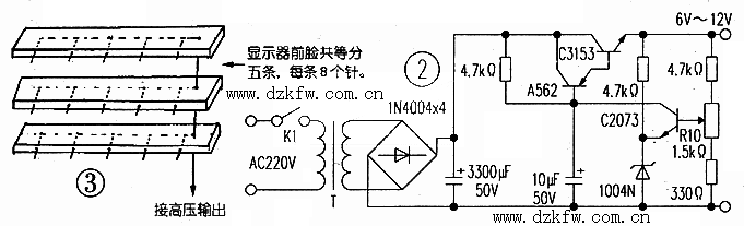 笔者把全部元件安装在原14英寸电脑显示器的外壳里。放电针用6cm长的大马针掐去4cm多余部分,按每条8个针等份烫压在长24cm、宽2cm、厚6mm的有机玻璃条上,针尖8mm长露在外面,针尾用细铜线串联焊好,露线部分用高压绝缘胶添平。全屏上下共分五条,用高压绝缘线上下串联接在高压输出端。有打火处用绝缘胶封好。如图3所示。