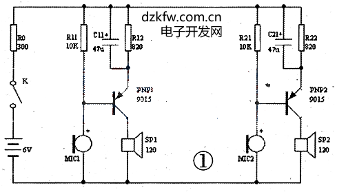 话筒MIC的语音信号引起本端9015三极管的电流变化,在Ro(300Ω)电阻上产生电压变化信号.一部分电压变化信号进入另一端的三极管发射结进行放大,在耳机上产生声音输出。由于输出功率不大,耳机与话筒之间有一定距离(对于一般的电话手柄,此距离大于12cm),传向话筒的回馈很小,不会引起啸叫,实际使用也无任何不适,所以不用消侧音电路。本电路无振铃,开关K闭合即可进行双方通话,语音清晰,噪音非常小。电源电流为2.2mA~7mA.平均电流只有4.5mA,极为省电。电源电压在4V~10V范围内均可正常工作(电压过高可能会烧掉MIC)。经实测,两对讲分机间的距离长达300m时仍可正常通话。如果再并联一组分机电路.可实现三方通话。