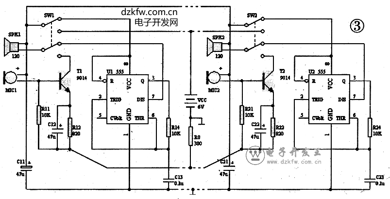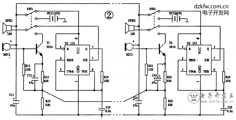 1.两分机都挂机时.电源VCC处于断开状态,整个装置不耗电。2.若左侧分机摘机,插簧抬起.左侧的电源通过导线向右侧供电,右侧的555振荡电路工作,SPK2发出振铃音,其频率为1/(1.4×R24×C23)=1/(1.4×10kΩ×0.1u)=714Hz。同时,左侧也能听到较小的振铃音。3.若右侧也摘机.插簧抬起.两侧的555都断开电源,两侧电源并联向通话电路供电,形成与图1相似的对讲电路,可进行双方通话。4若一侧挂机,本侧插簧压下.本侧555电路工作.耳机发出振铃音。当另一侧也挂机时.回到1状态.工作过程结束。