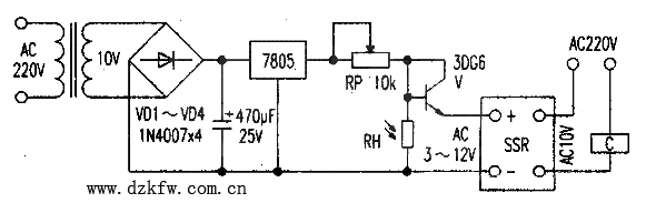 工作原理在附图中,变压器次级输出10V电压经整流滤波后,途经7805三端稳压器获得+5V工作电压。由光敏电阻RH和三极管3DG6及微调电阻RP组成光电开关。白天RH受光照呈低电阻,3DG6处于截止状态,故固态继电器SSR不工作,夜晚RH无较强光线照射呈较高电阻,3DG6获得合适偏流导通,固态继电器工作。