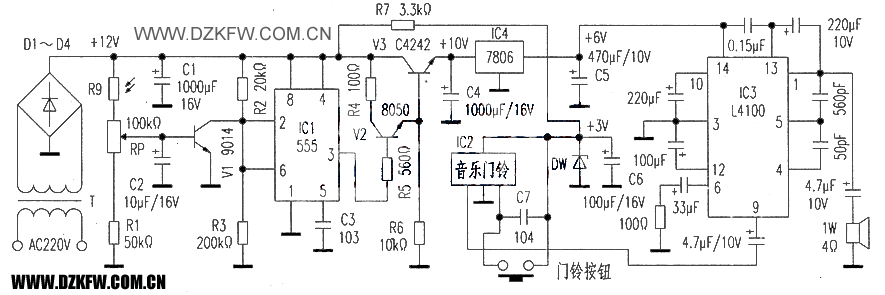 该门铃电路(见附图)由电源电路、开关电路、光控电路、音乐门铃电路及功放电路组成.电源电路由变压器T1、D1-D4、C1等组成。通电后在电容c1两端可获得12V直流电压供时基电路IC1(555)工作。12V电压一路经R7、DW、c6稳压成3V直流供软封装音乐门铃IC2.另一路经用作电源功率开关的V3、三端稳压器lC4(7806)为功放集成电路Ic3(4100)提供稳定的6v电压。