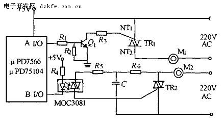 在光电耦合电路接口中, 驱动电路由双向光电耦合器OC1 (MOC3081) 和双向可控硅TR2 和电机M2 等元件组成, 其工作过程如下: 当B 口I/O