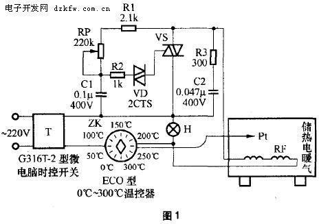 储热电暖气的控制原理如图1所示。图中,由时间控制开关T与温度控制器ZK构成输入温度控制电路。T是一台G316T-2型微电脑时控开关,工作电压为220V/50Hz,额定电流25A,由人工进行分段时间设定,以控制储热电暖气的通电时间与断电时间,具有控制准确可靠、操作方便、使用寿命长等特点。ZK是ECO型0℃~300℃温度控制器,将其温度传感器Pt置入储热电暖气的储热砖中,调节转换开关ZK至设定温度值处,电源指示灯H点亮。而由R1、RP、C1、R2、VD及VS构成输出控制电路。利用相位控制改变晶闸管VS的导通角,可以实现无级调温。电阻R1, 电位器RP、电容C1组成移相电路,R2为晶闸管VS触发的限流电阻。电流经R1、RP向C1充电,晶闸管VS的导通角由C1的充电时间常数决定,改变RP可改变C1的充电时间常数,即改变了VS的导通角,也就改变了负载储热电暖气电加热管RF上的端电压,从而改变了RF电流的大小。